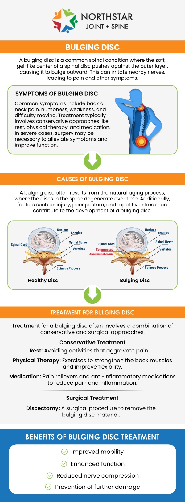 If you’re suffering from the discomfort and pain of a bulging disc, seeking the expertise of a skilled treatment specialist is essential. At Northstar Joint and Spine, Dr. Robert J. Nocerini, a board-certified pain management specialist, offers comprehensive treatment options to address bulging discs. Our team focuses on relieving pain, restoring mobility, and improving your quality of life through personalized treatments tailored to your needs. For more information, please contact us today or schedule an appointment online. We are conveniently located at 7704 San Jacinto Pl Suite #200 Plano, TX 75024.